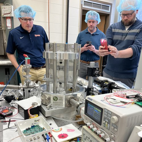 A&S communications team members (from left) Dan Bernardi, Sean Grogan and Casey Schad observe an experiment in Mansell’s lab.