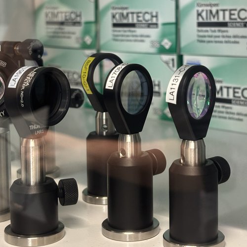 Different types of precision mounts in Mansell’s lab designed to securely position lenses in optical setups.