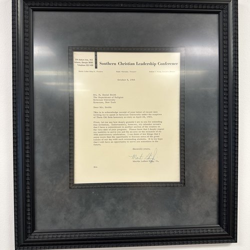 One of the Martin Luther King, Jr. Library’s prized holdings is a letter signed by Dr. King, responding to an invitation from former religion professor Daniel Smith to speak at Syracuse University.