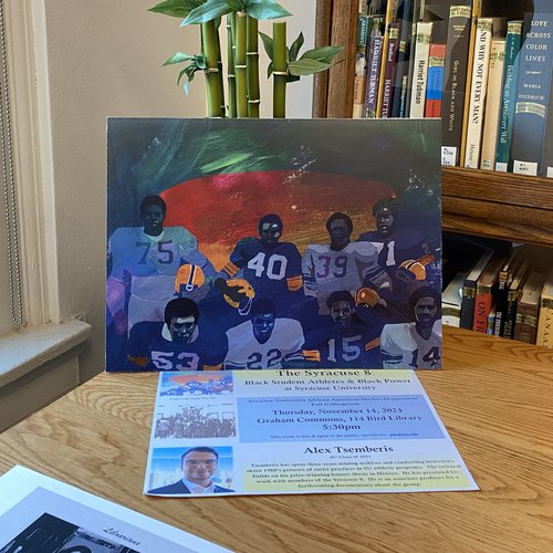 A painting in the Martin Luther King Jr. Library depicting the “Syracuse 8,” a group of African American Syracuse University football players who boycotted the 1970 season to protest racial discrimination and for better player treatment.