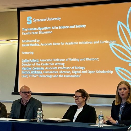 The afternoon featured a panel session entitled "The Human Algorithm: AI in Science and Society," moderated by Associate Dean for Academic Initiatives and Curriculum Laura Machia. The discussion brought together Associate Professor of Writing and Rhetoric Collie Fulford, Associate Professor of Biology Heather Coleman and Humanities Librarian Patrick Williams, exploring how artificial intelligence is reshaping both scientific research and societal structures.