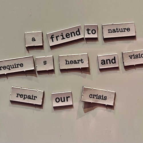A clever and heartfelt haiku reading, "A friend to nature requires heart and vision, repair our crisis."