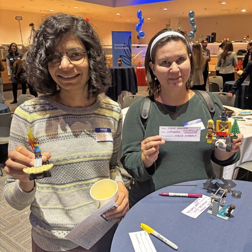 Physics professors Nidhi Pashine (left) and Mirna Skanata (right) with their Lego creations.