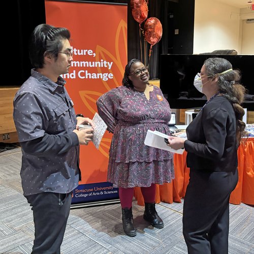 Professors Tao Wen (left) and Anne Leone (right) talking with Associate Dean of Strategic Initiatives Gwendolyn Pough (center) at the Culture, Community and Change pillar table.
