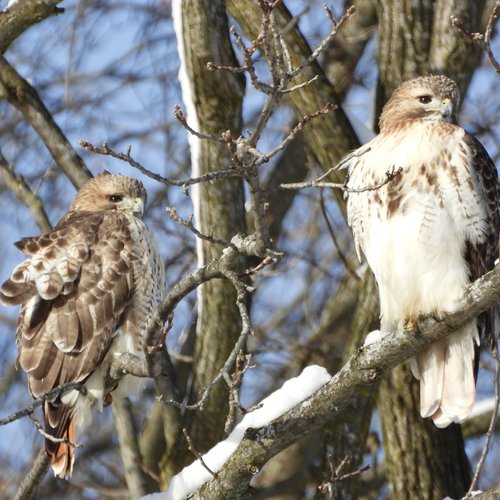 Cliff and Ensley perch together in a tree near the Syracuse University campus. (Photo courtesy of Anne Marie Higgins)
